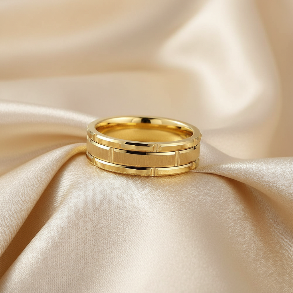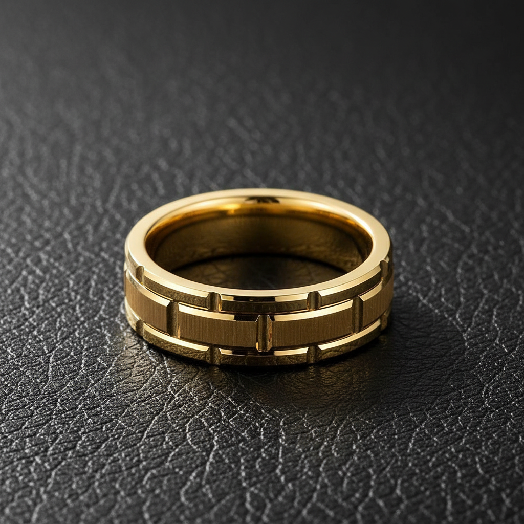 18K Gold PVD Plated Titanium Coated Stainless Steel Ring | Men’s Brushed Geometric Architectural Band | 8mm Comfort Fit