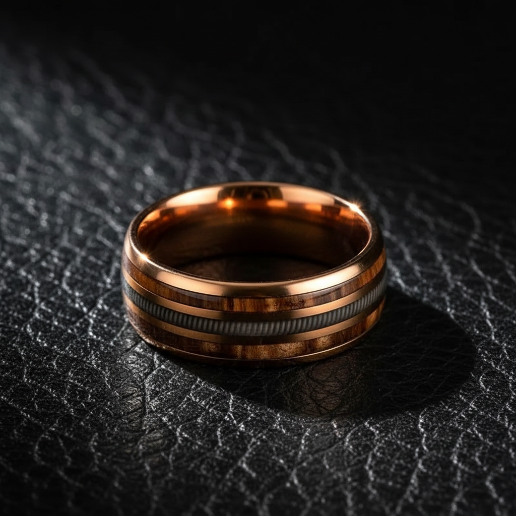 Elevate your style with this unique handcrafted wedding band featuring authentic guitar string and whiskey barrel wood inlays. Durable 316L stainless steel with a luxurious rose gold finish. Shop now for a timeless vintage look.
