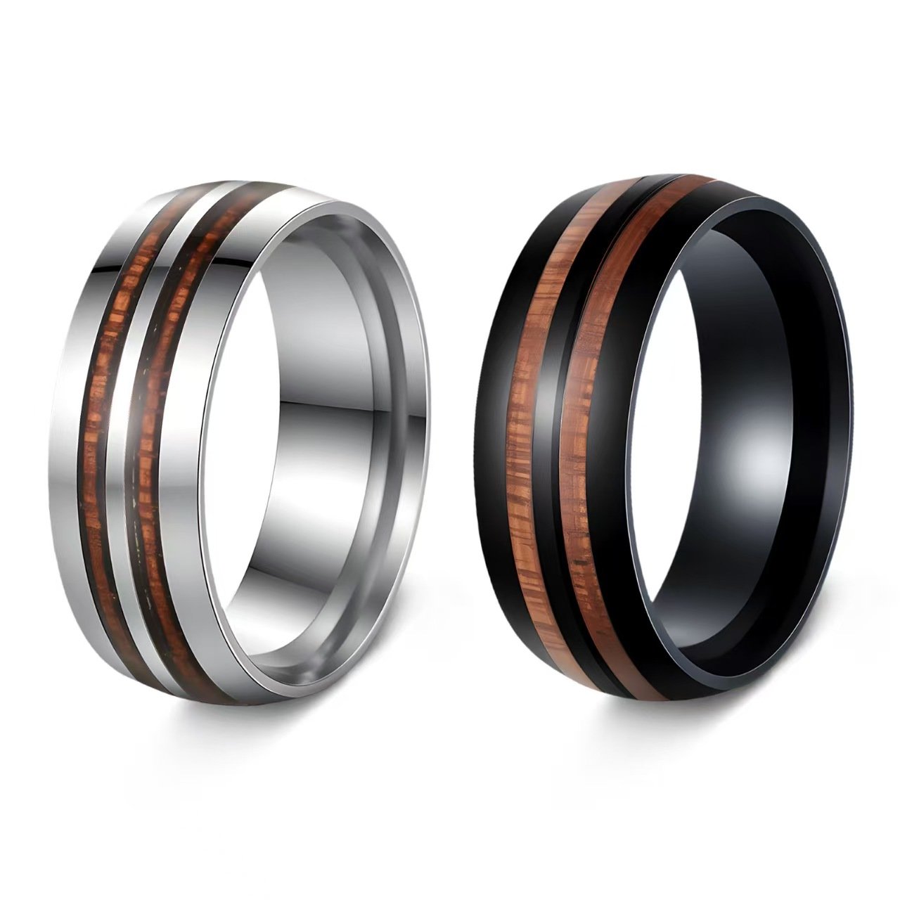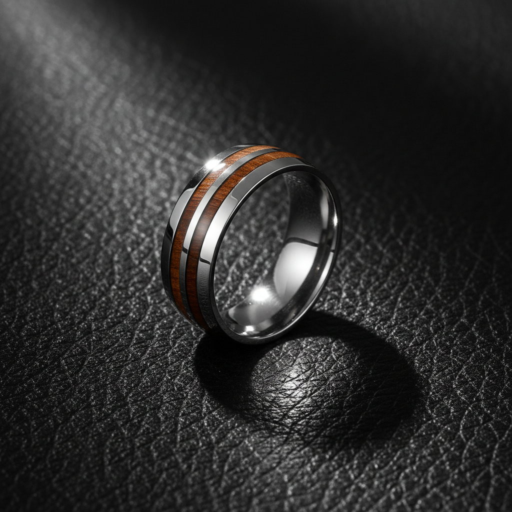 Elevate your commitment with this premium 304 stainless steel ring featuring a unique double acacia wood inlay. Hand-polished to a mirror finish, this minimalist band offers a perfect blend of industrial strength and organic warmth. Shop the ultimate hypoallergenic engagement ring today.