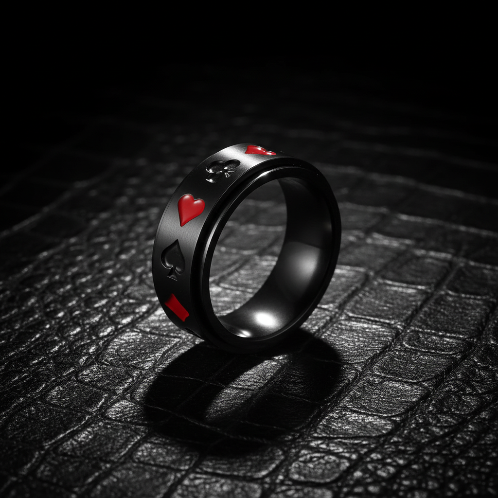 Elevate your techwear aesthetic with this 304 stainless steel spinner ring. Featuring a sleek black brushed finish and etched playing card suits, it combines stress-relief functionality with edgy cyberpunk style. Shop the ultimate fidget accessory for daily wear.