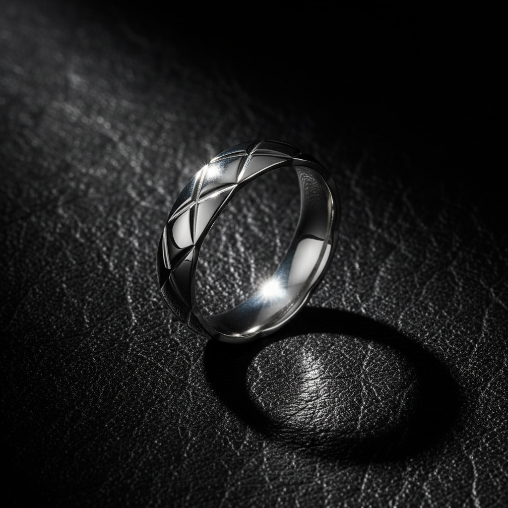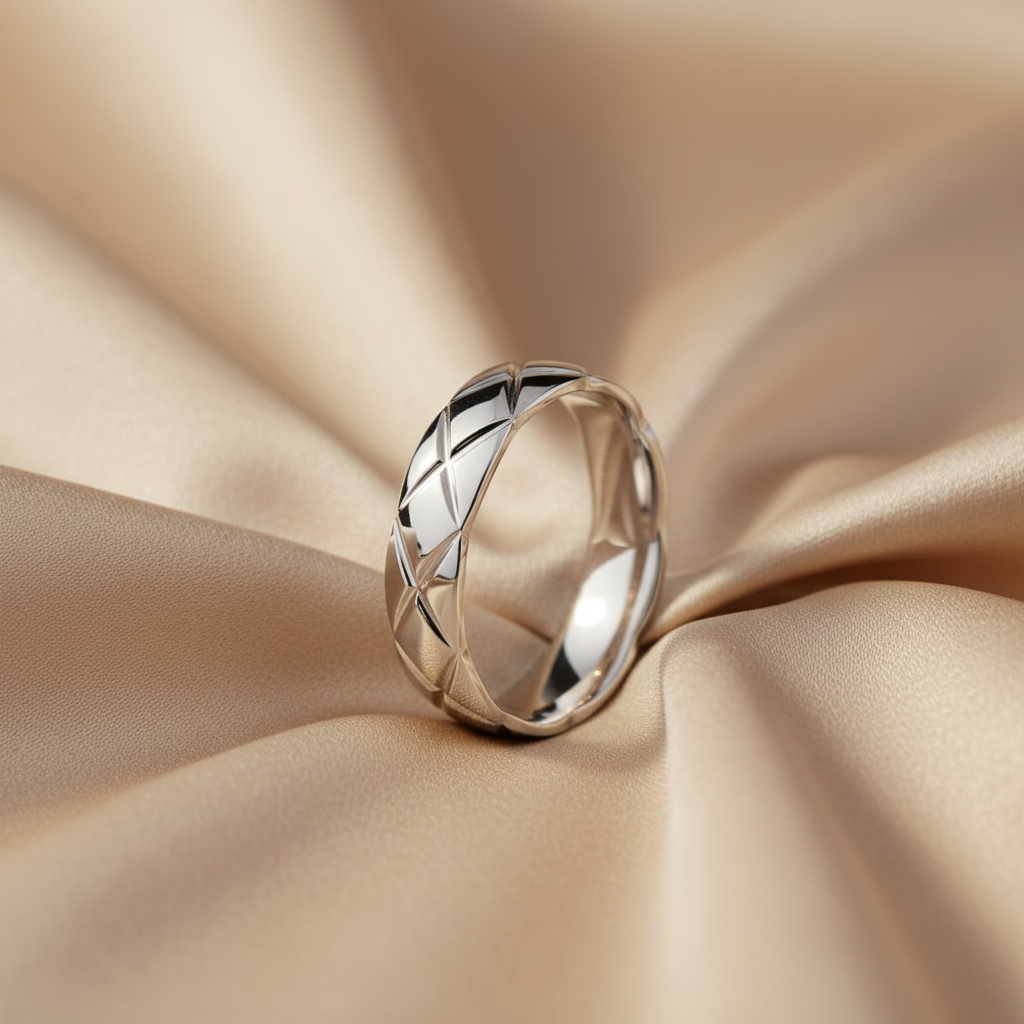 Elevate your style with this precision-cut 316L stainless steel ring featuring a sophisticated quilted lattice pattern. Perfect as a minimalist wedding band or a modern fashion statement. Shop this anti-tarnish, hypoallergenic luxury piece now.