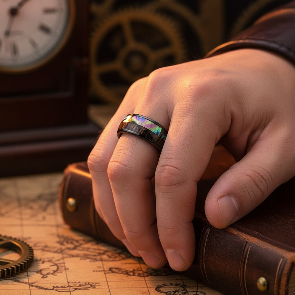 Genuine Iridescent Abalone Shell: Each ring features a hand-selected shell inlay, offering a unique spectrum of blues, greens, and purples that shift in the light.