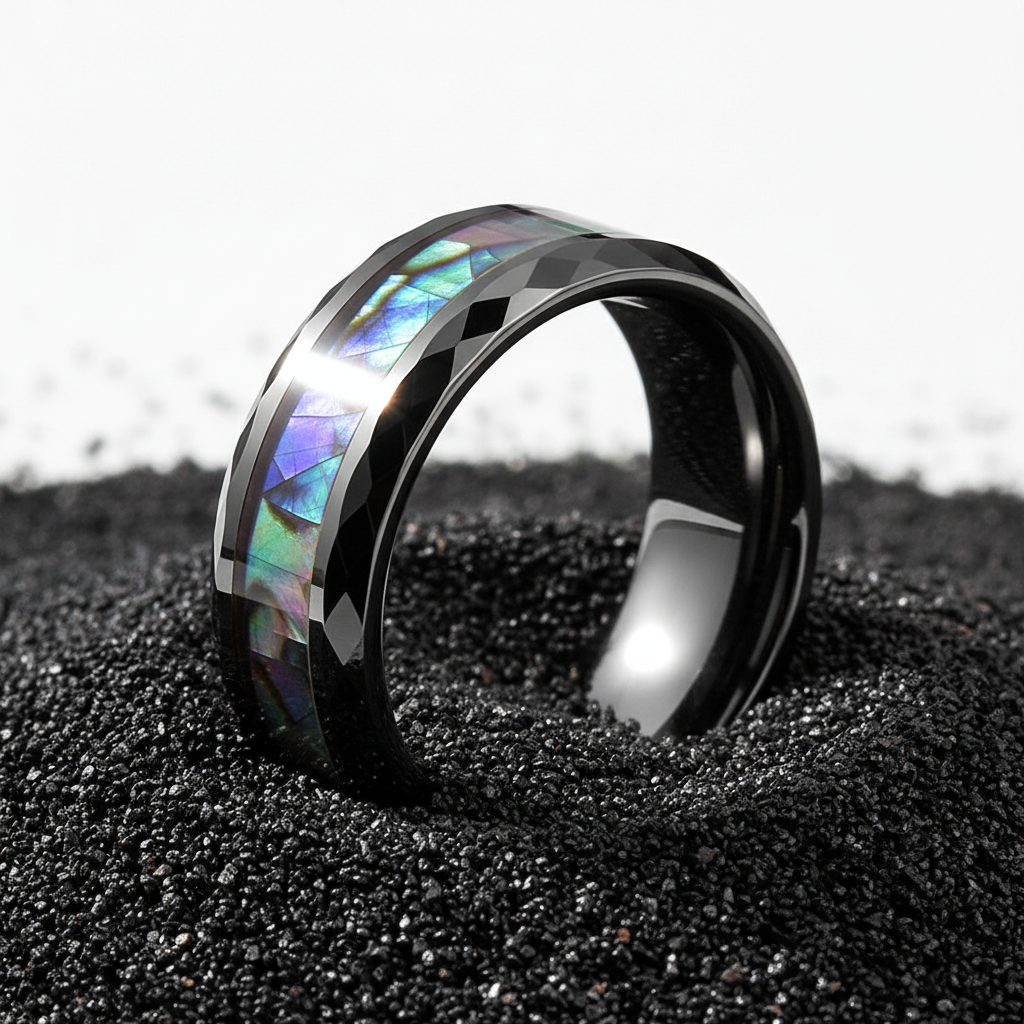 Tungsten Carbide Abalone Shell Wedding Band – Black Faceted Hammered Ring for Men & Women – Hand-Polished Classic Jewelry